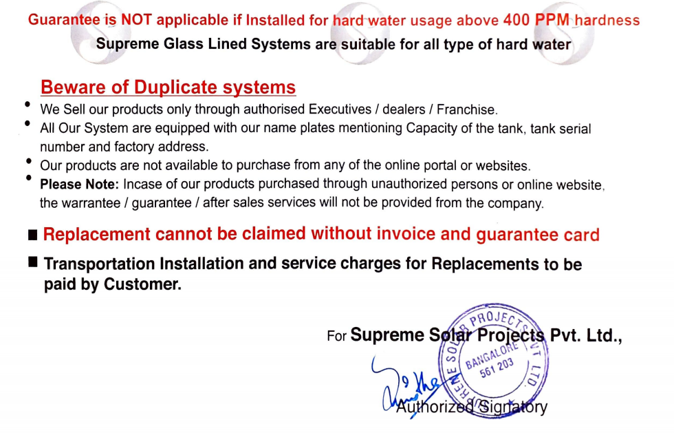 Corrosion-Resistant Materials like Glass Lined: Supreme Solar water heaters are constructed using high-quality materials like Glass Lined that are resistant to corrosion caused by hard water minerals. This ensures a longer lifespan for the water heater and reduces the need for frequent repairs and replacements. Some of the Materails used as Anti corrosion are Ceramic and Glass Lined.