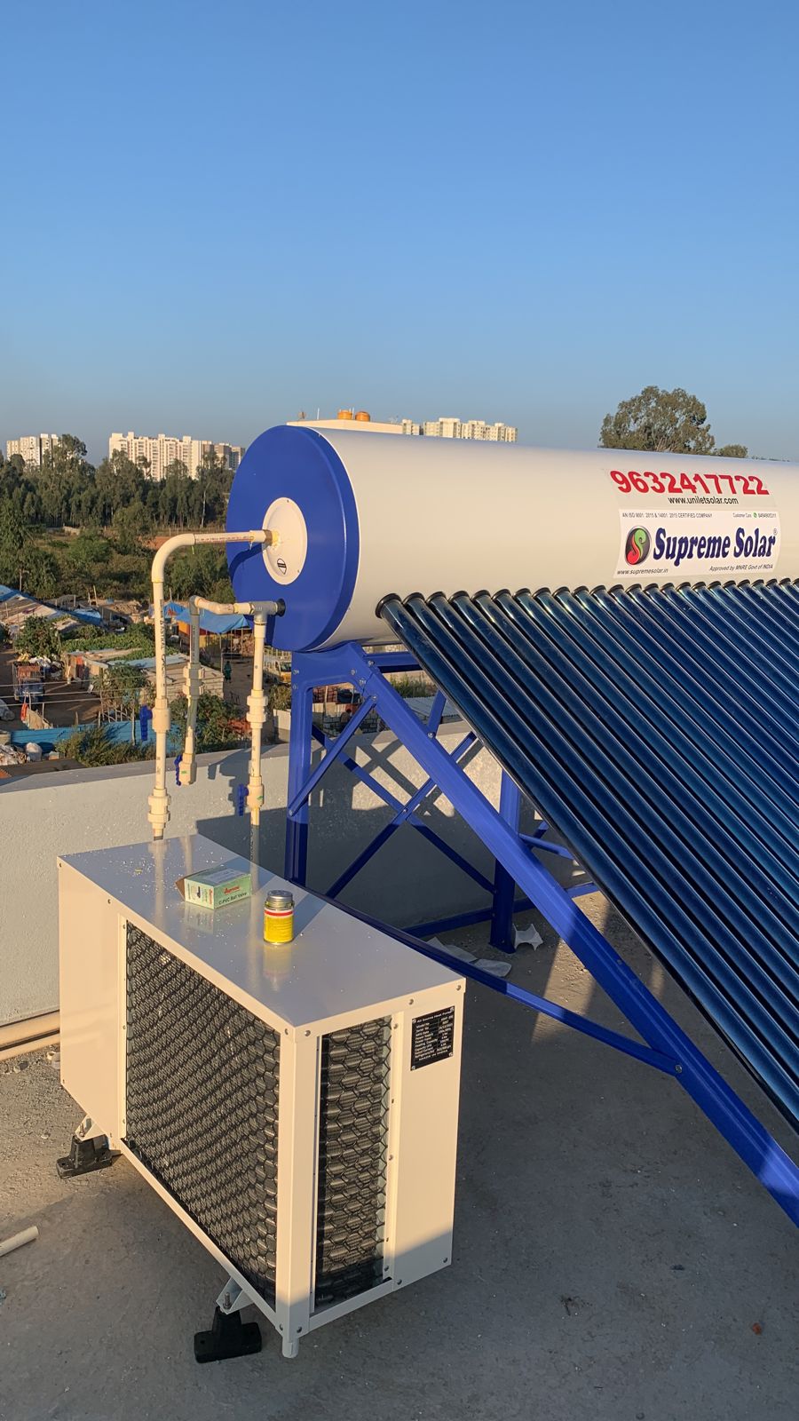 Supreme Solar & Heatpump 500 Ltrs combo system for 24 Hour all weather hot water on demand. Heatpump consumes very low electricity, this product consumes 1kw electricity to produces heat of equl to 4kw heat. This is a very good product for commercial use to, like for small PG houses.