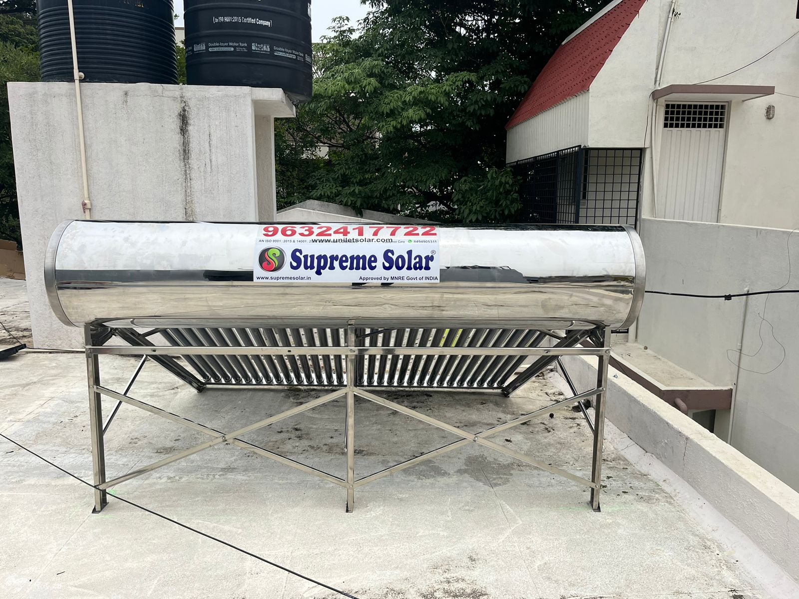 Supreme Solar 200 Ltr Full Steel Budget-friendly solar water heater with 200 ltr capacity is the most used and sold product in India. This product is well suited for a family of 4 to 5 and serves up to 3 bathrooms.
